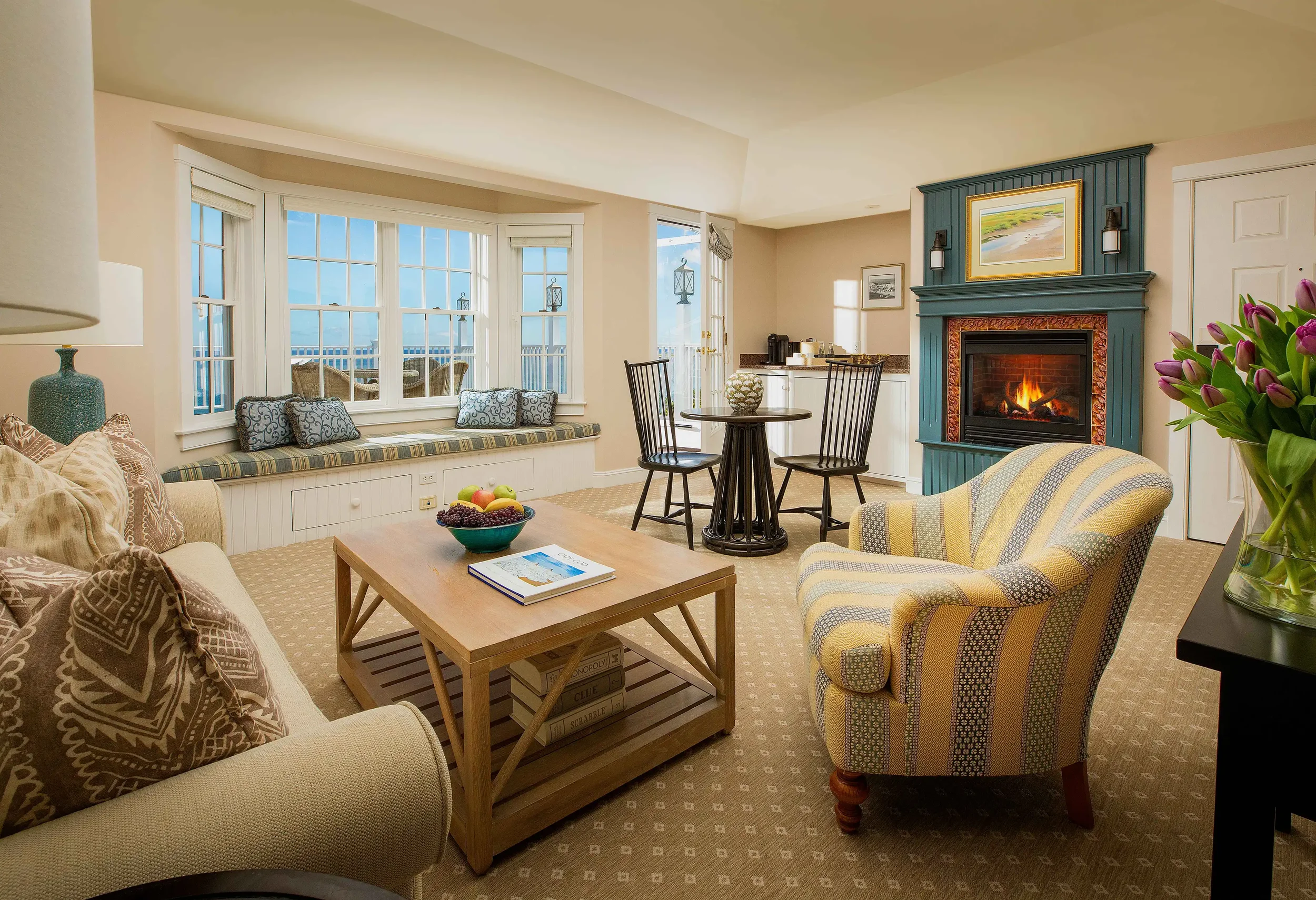 Overlooking its own stretch of private beach, Chatham Bars Inn has been a Cape Cod favorite for more than a century. While the main inn channels early 20th-century elegance, the standout accommodations for fall are the seaside cottages and suites, many with private fireplaces. Off-season, when the Cape is quieter and evenings turn crisp, guests can harvest pumpkins at the inn’s farm, book a clam-digging excursion, or enjoy a seafood dinner with the Atlantic as backdrop. Fireplaces turn these cottages into true cozy havens after a day of coastal walks, making fall stays here as memorable as high summer.